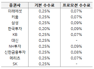 기본 수수료는 한국투자증권을 제외하고 모두 0.25%로 동일하지만 프로모션 수수료는 각양각색으로 나옵니다.