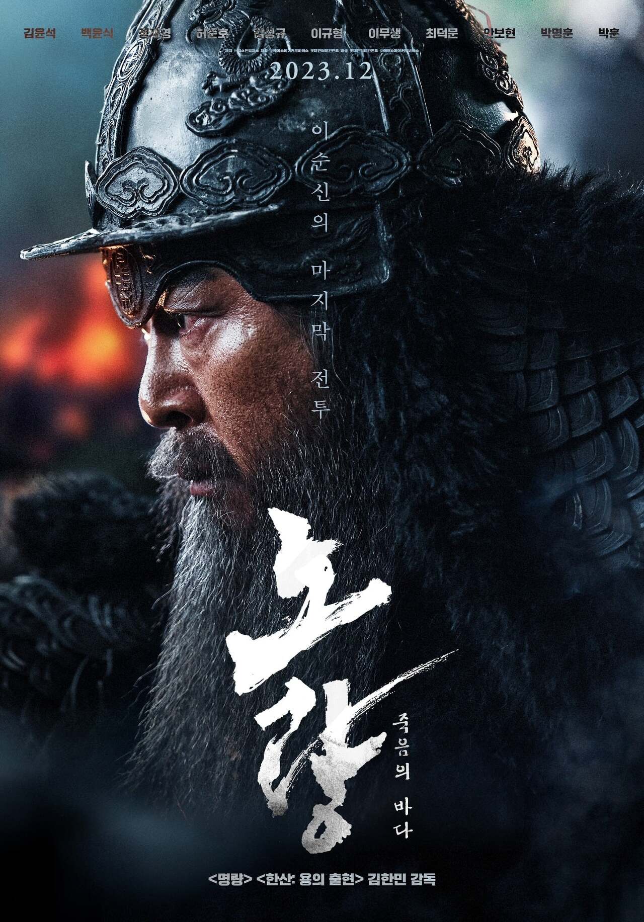김한민 감독의 이순신 3부작의 마지막인 노량이 개봉 예정입니다. 명량 한산의 흥행돌풍을 이어갈 것이 거의 확실시되는 작품이니 이번에도 1천만 관객이 볼 것인지 흥미롭게 지켜보겠습니다. 사실 역사에서는 한산 명량 노량 순서인데 영화 개봉 순서는 명량이 가장 앞에 이뤄졌습니다. 이번 작품은 김윤석 배우가 이순신 역할로 나오고 백윤식 배우는 일본군의 시마즈로 나오고 허준호, 여진구, 정재영, 최덕문 등 유명 배우들이 대거 등장합니다. 뿐만 아니라 제목에 걸맞게 수군들의 해전 시간만 100분에 가깝다고 하니 얼마나 고증을 잘했는지 실감나게 촬영이 되었는지를 주의 깊게 지켜보는 것도 영화를 바라보는 큰 재미가 되겠습니다. 노량은 역사서에 따르면 거북선이 등장하지 않는 해전으로 나옵니다. 이전의 전투들에서 거북선이 격침되었고 노량해전의 시기까지 시간이 빠듯해서 판옥선만 건조하여 전투에 참여한 것으로 알려졌는데 거북선이 없는 이순신 장군의 해전이 어떻게 나올지 관심이 가는 부분입니다. (물론 일부 역사가들은 거북선이 등장하지 않았다는 기록도 없으니 거북선 없이 참전한 것은 확실하지 않다는 분들도 있습니다)